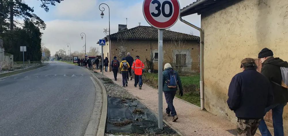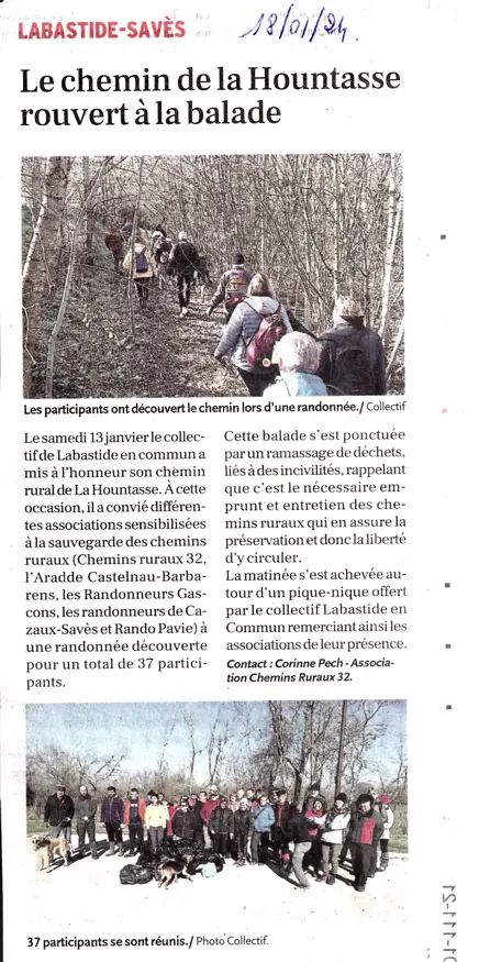 À l'appel du collectif "Labastide en Commun" et de l'association "Chemins Ruraux 32", les adhérent(e)s de plusieurs associations de randonnée (dont ceux de l'ARAD, des Randonneurs Gascons, de Rando Pavie...) se sont rendus ce samedi 13 janvier à Labastide Savès pour soutenir la demande de mise en état et de sécurisation du chemin rural "la Hountasse" qui longe la départementale D 634 reliant Samatan et Lombez à l'Isle Jourdain.