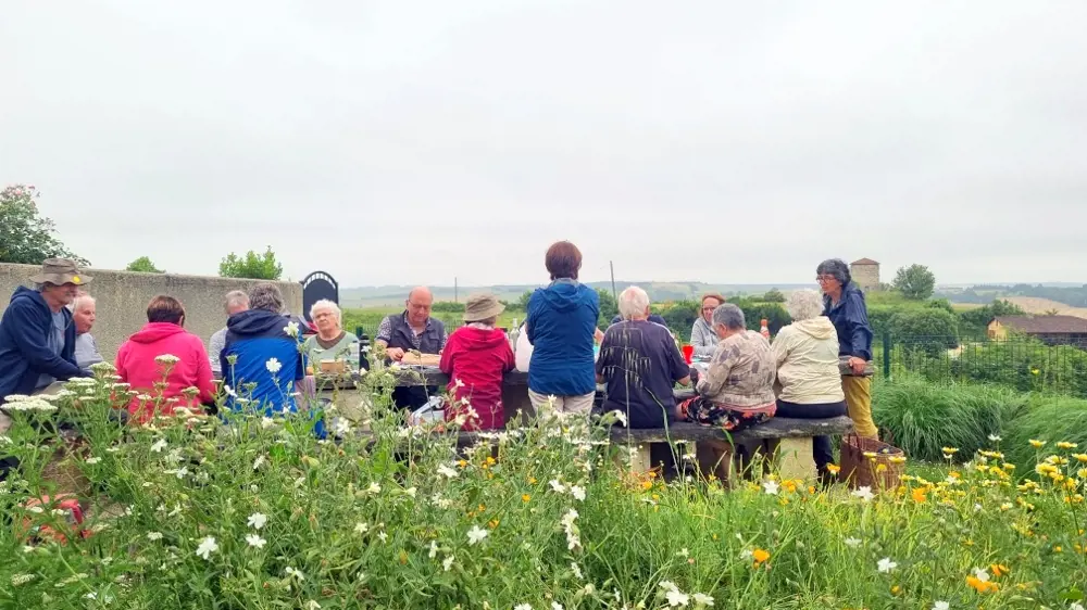 3 heures de marche plus tard nous revenons à Saint Puy où un vide-grenier fournit les barquettes de frites pour le pique-nique ! Près de l'église une grande table nous attendait, à croire qu'elle avait été installée spécialement pour nous !
