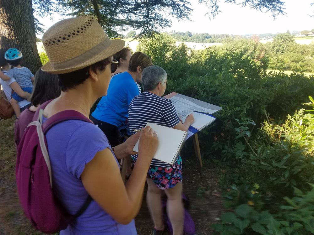 Première étape à l'église Saint-Pierre-ès-Liens où le panorama digne d'une "Petite Toscane" est soumis aux coups de crayon des participants.