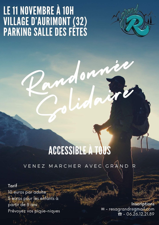 Randonnée Solid' R ! L'association Grand'R propose des activités de plein air destinées à des adultes en situationde handicap. Les différences s'estompent et disparaissent, laissant place à une aventure humaine intense. Le 11 novembre l'association Grand'R organise une randonnée solidaire au départ du village d'Aurimont. Rendez-vous à 10h sur le parking de la salle des fêtes. Inscriptions au 06 26 12 21 89 ou par mail : resagrandr@gmail.com Tarifs : 10€ pour les adultes, et 5€ pour les enfants à partir de 8 ans. Prévoyez vos pique-niques. Découvrez un parcours de 9 kms à travers cham... Lire la suite