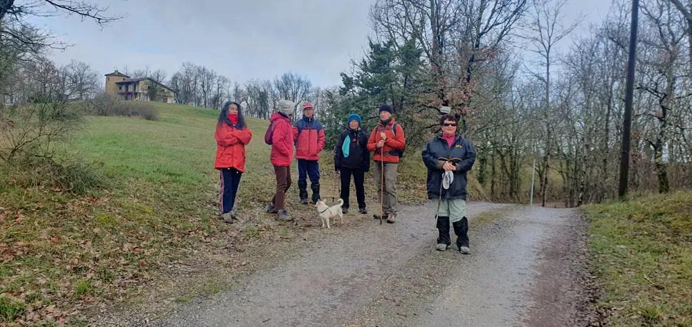 Au parking de la salle des fêtes, 7 randonneurs décidés sont prêts à s'aventurer sur les chemins boueux.