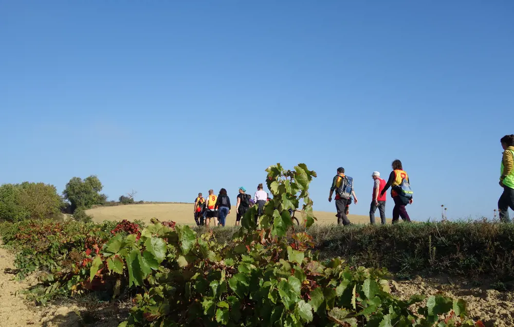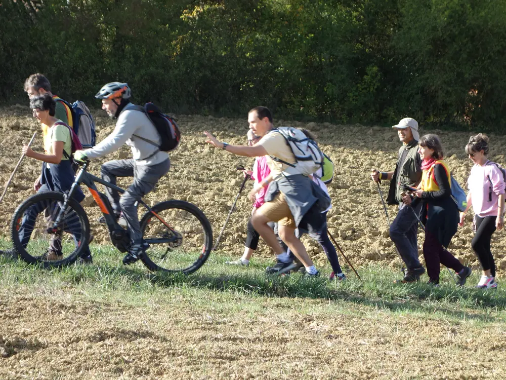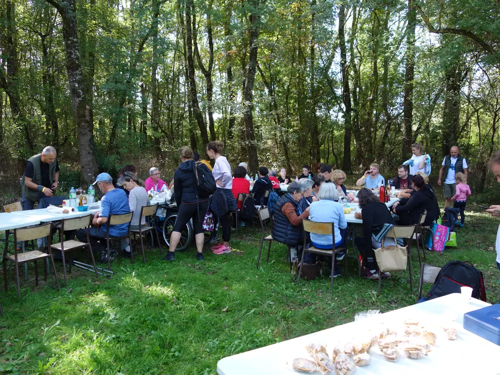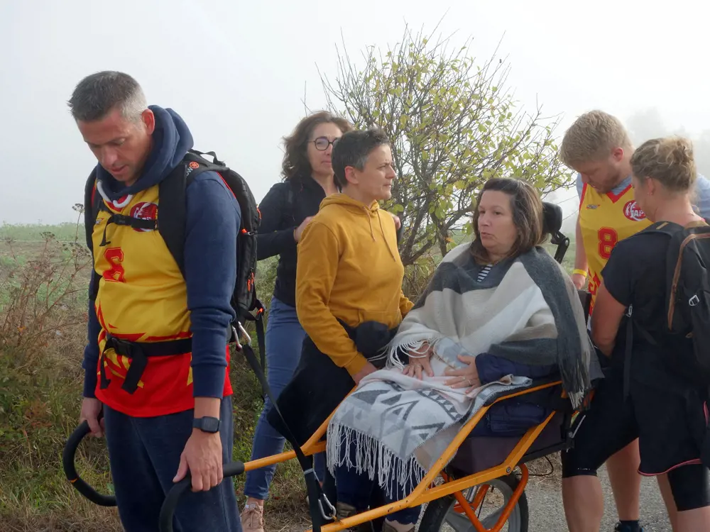 C'est dans une brume légère que se met en branle le convoi qui s'apprête à conquérir les sommets castelnausiens. Ah! Ils (OK, c'est bon, elles aussi!) sont vaillants les convoyeurs de joëlette en tête de la troupe. Tellement vaillants que la colonne s'étire et se scinde faute de pouvoir suivre le rythme! Quelques arrêts sont nécessaires pour rassembler tout le monde.